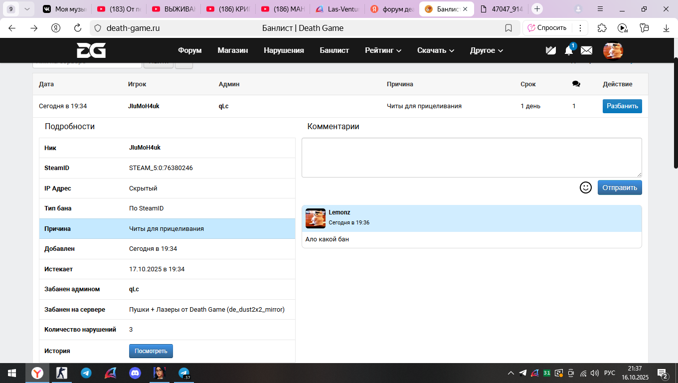 Демо+видео 5 минут перед баном+скриншоты бана+наказание неверное