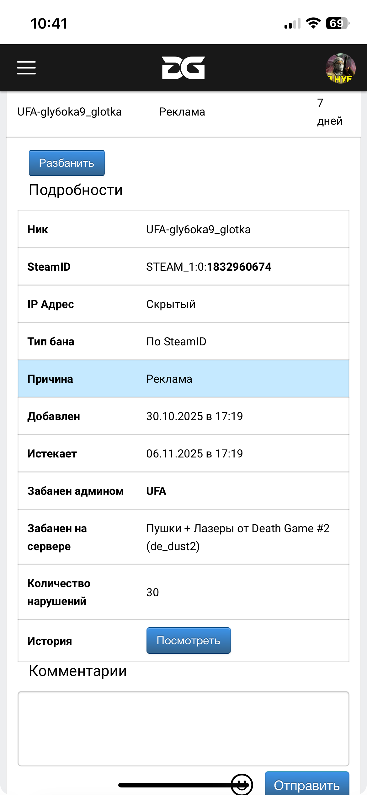 Держу в курсе, когда банишь через меню сервера по причине рекламы, система автоматически ставит неделю. Тут не из за чего лишать админки. Даже если бы такое случилось, я бы просто написал Матвею в личку по этому поводу