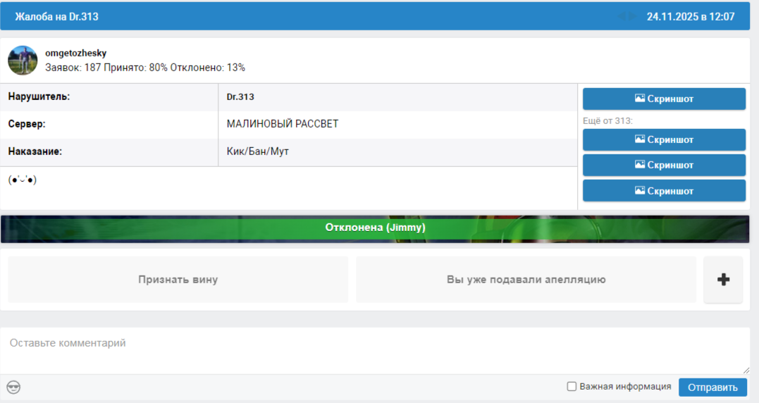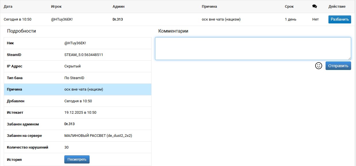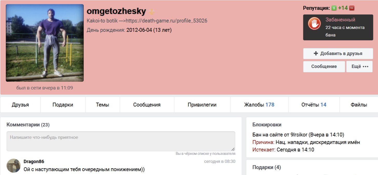 АНАЛогичная "Подставная" жалобка была отвергнута самим гл. админом. Данный плауерОК разжигает межнациональную розню одним словом "Нацист". Добавлю, что данный игрочек неоднократно получал бан именно за оскорбление вне чата с такими никами как: pisklyavaya yzbe4e4ka, ne pla4' - @HTu4yPK@ - HaBcErgA! - @HTu4yPK@ - 4 HoBa9I yrPo3a! - ГенаЦидчурок. А так же стоит упомянуть что сам главный админ банил его за НЕАДЕКВАТНОСТЬ https://death-game.ru/profile_53026