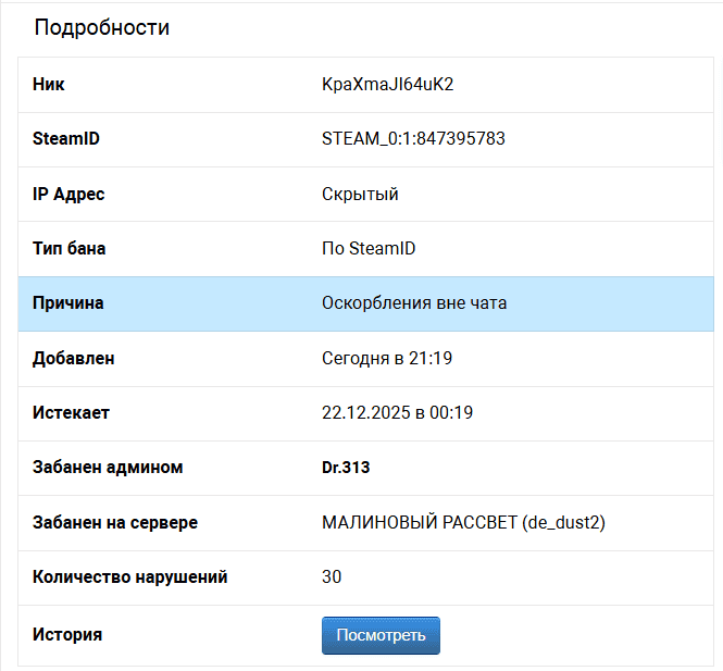 И так что мы тут видим, нарик без конца под оскорбительными никнеймами заходит сервер. Получает бан. То что на скриншотике не видно оскорбления, зайди в мой профиль в гости, прочти мое имя может дойдет и найдешь оскорбление. Меня Акмаль зовут, неадекват нарик под ником КРАХМАЛЬЧИК заходит в сервер и соответственно получает бан за оск вне чата. в качестве контр аргумента я предоставил его баны за оск вне чата + где он с сайта оскорбляет меня называя Крахмальем, Хачмальем и Акмальем. А авторишу данной жбшечки прошу наказать за подставную жб