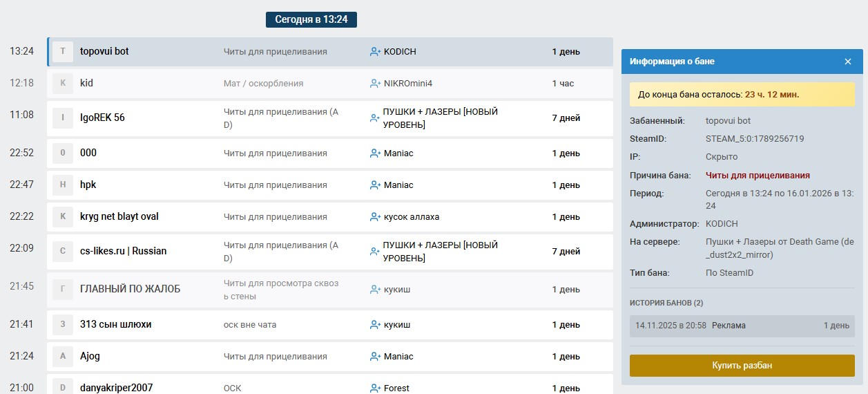 | Наказание: | Кик/Бан/Мут |