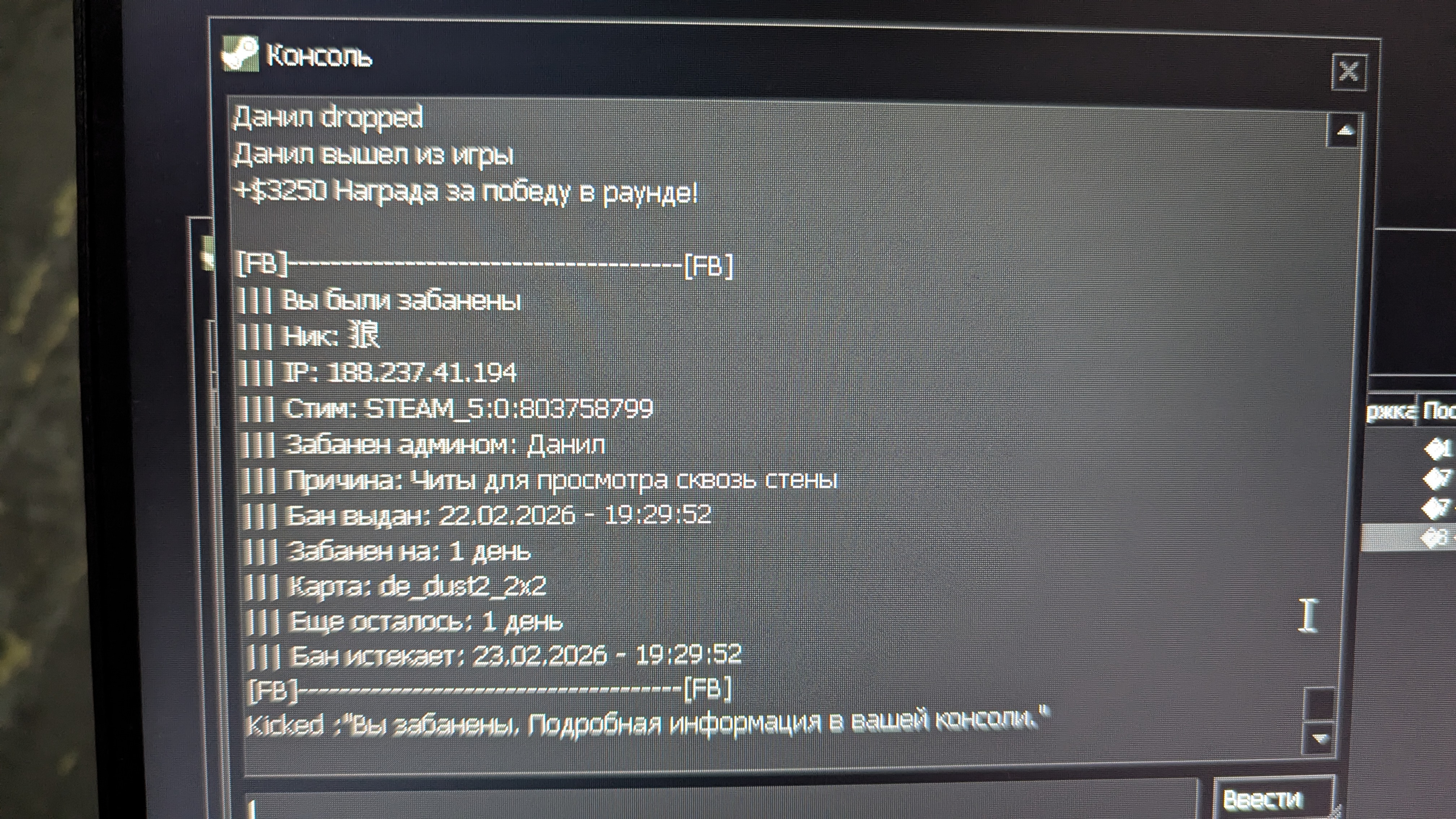 | Я, игрок под ником 狼, обращаюсь к высшей администрации проекта с требованием пересмотреть бан, выданный мне администратором Данил (22.02.2026 в 19:29:52). Дал бан и выше | |