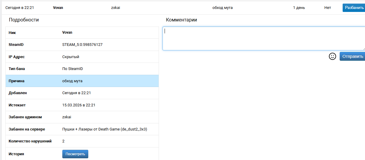 ну вообще ты мог скинуть скрин банлиста, т к причины обход мута нет как я знаю